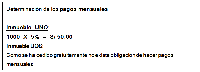 El Sr. Juan Espinoza debe hacer pagos mensuales por el Inmueble UNO de S/ 50.00 mensuales.