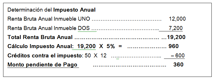 Para calcular debes sumar el total de tus ingresos de alquileres obtenidos durante todo el año, luego le aplicas la tasa del 5% y el resultado de este será el impuesto anual.