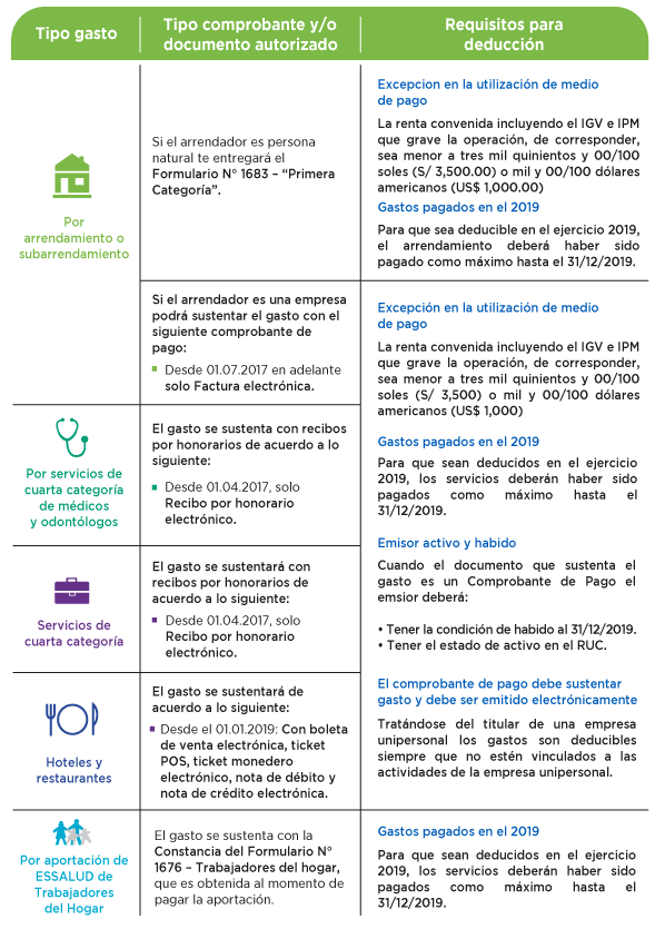 Dichos gastos pueden deducirse hasta por un 15% de lo pagado con un límite máximo de 3 UIT de manera independiente o junto a otros conceptos deducibles (S/ 12,600 para el 2019).