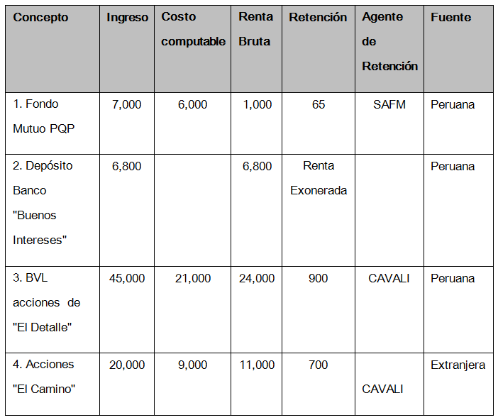 1. En mayo 2018 invirtió S/ 6,000 en el “Fondo Mutuo PQP” el cual es administrado por la Sociedad Administradora de Fondos Mutuos (SAFM) “Invierte”. Luego en noviembre del 2018 el señor Flores rescata su inversión recibiendo la suma de S/ 7,000 menos una retención de S/ 50.