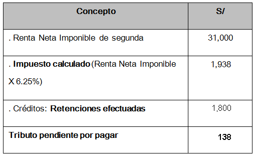 Este tipo de renta de segunda categoría sólo se determina anualmente, también debe considerarse la Renta Neta de Fuente Extranjera generada por los mismos conceptos siempre y cuando, cumpla con los requisitos que establece la ley para ser sumadas a las rentas de segunda.